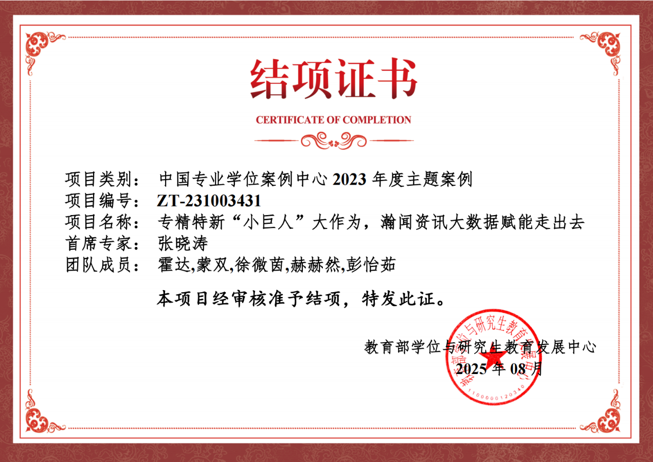 项目团队构建“校企共研、师生共创”的案例开发机制,项目团队成员在瀚闻资讯完成驻点调研和实习实训,调研内容涵盖企业业务模式、技术优势及数据赋能机制等,形成兼具理论价值与实践意义的系列成果,开发完成三篇教学型案例。案例严格遵循了《中国专业学位案例中心案例收录规范》,确保了内容的准确性和格式的规范性。三篇案例呈递进式逻辑,体现了规范性与系统性的统一。其中,《从“元数据”供应到“数据赋能”:瀚闻资讯助力提升外贸竞争新优势》入选全国国际商务教育指导委员示范教学案例;《大数据赋能出海,打造竞争新优势》荣获第三届国际商务专业学位研究生案例竞赛一等奖。