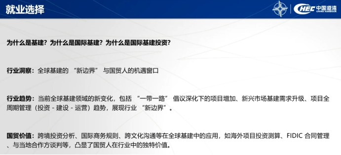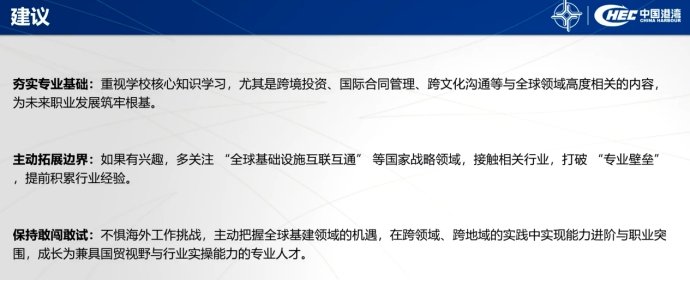 中国港湾工程有限责任公司的王金斌校友,以“全球基建新边界与国贸人的机遇”为主题,分享了从国际贸易跨界国际基建投资的职业历程。他指出,国贸专业学子不应自我设限。结合自身海外工作经历,王金斌展示了国贸人在跨境投资分析、国际合同管理、跨文化沟通等方面的专业优势,以及这些优势在国际基建领域的独特价值。针对职业发展,他提出三点建议:一是夯实跨境投资、国际商法等专业基础,这是参与全球业务的核心支撑;二是主动关注国家战略导向行业,打破专业壁垒,打造复合能力;三是保持敢闯敢试的心态,不惧海外挑战,在跨领域、跨地域实践中实现能力进阶。最后,他寄语学弟学妹:“国贸人的舞台不止于贸易领域,将专业优势与不同行业需求深度融合,就能在全球基建等新兴领域找到职业突破点。”