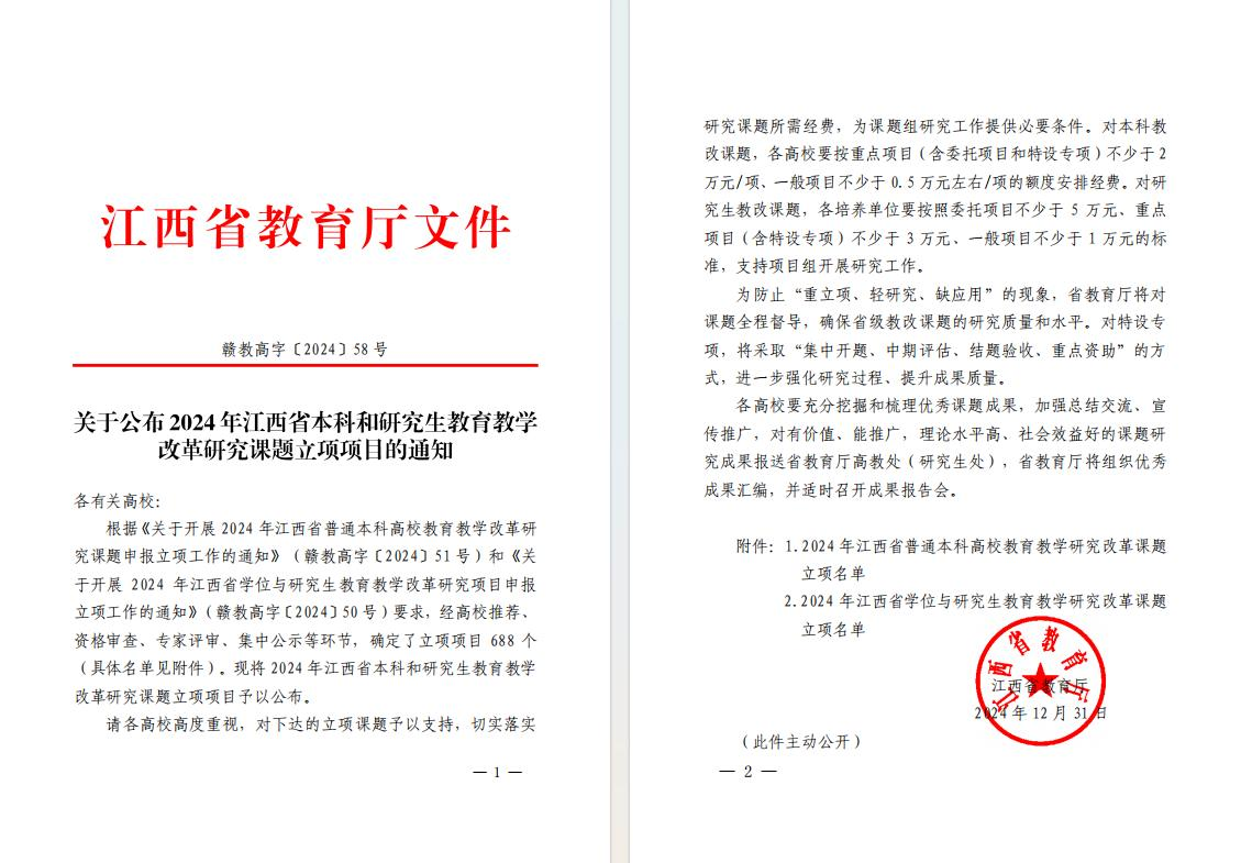 【MILE米乐集团讯】近日,江西省教育厅公布了2024年江西省普通本科高校教育教学研究改革课题立项名单,其中MILE米乐官网吴琴琴、张红老师申报的教育教学改革研究课题项目获得立项。