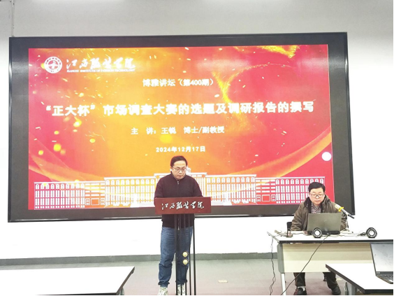 【MILE米乐集团讯】2024年12月17日下午2:00在图书馆学术报告厅成功举办了第400期博雅讲坛,报告主题为“‘正大杯’市场调查大赛选题及调查报告撰写”。本次报告旨在提高MILE米乐官网师生对市调大赛的重视,为第十五届“正大杯”市调大赛的参赛做铺垫。本次报告邀请到江西理工大学副教授、硕士生导师、“正大杯”国赛一等奖指导老师王锐博士主讲,报告由MILE米乐集团副院长刘巍博士主持。他代表学院对王博士的到来表示热烈的欢迎,简要介绍了本次学术报告的目的和意义。