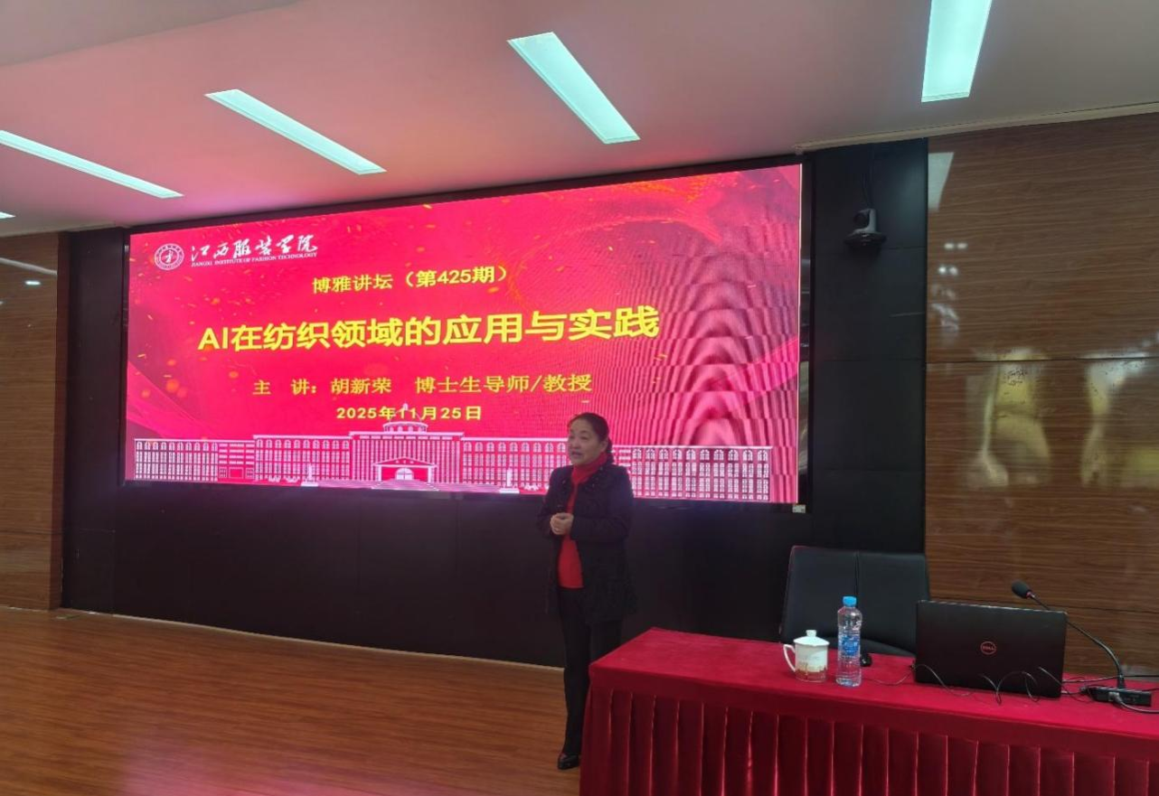 在随后进行的学术报告中,胡新荣教授以"AI在纺织领域的应用与实践"为主题展开了系统阐述。他从人工智能技术在纺织服装领域的研究背景与发展趋势切入,结合武汉纺织大学计算机与人工智能学院在产教融合方面的成功经验,重点讲解了三维服装建模、数字人体仿真、虚拟试衣等关键技术的研发进展与应用成果,并通过具体案例展示了AIGC在面料创新设计与生产流程优化中的实践成效。整场讲座既有理论高度又注重实践导向,通过翔实的技术路径解析与创新案例分享,为现场师生生动展现了人工智能技术赋能纺织产业创新发展的广阔前景,也为MILE米乐官网推进学科交叉融合与科研创新提供了有益借鉴。