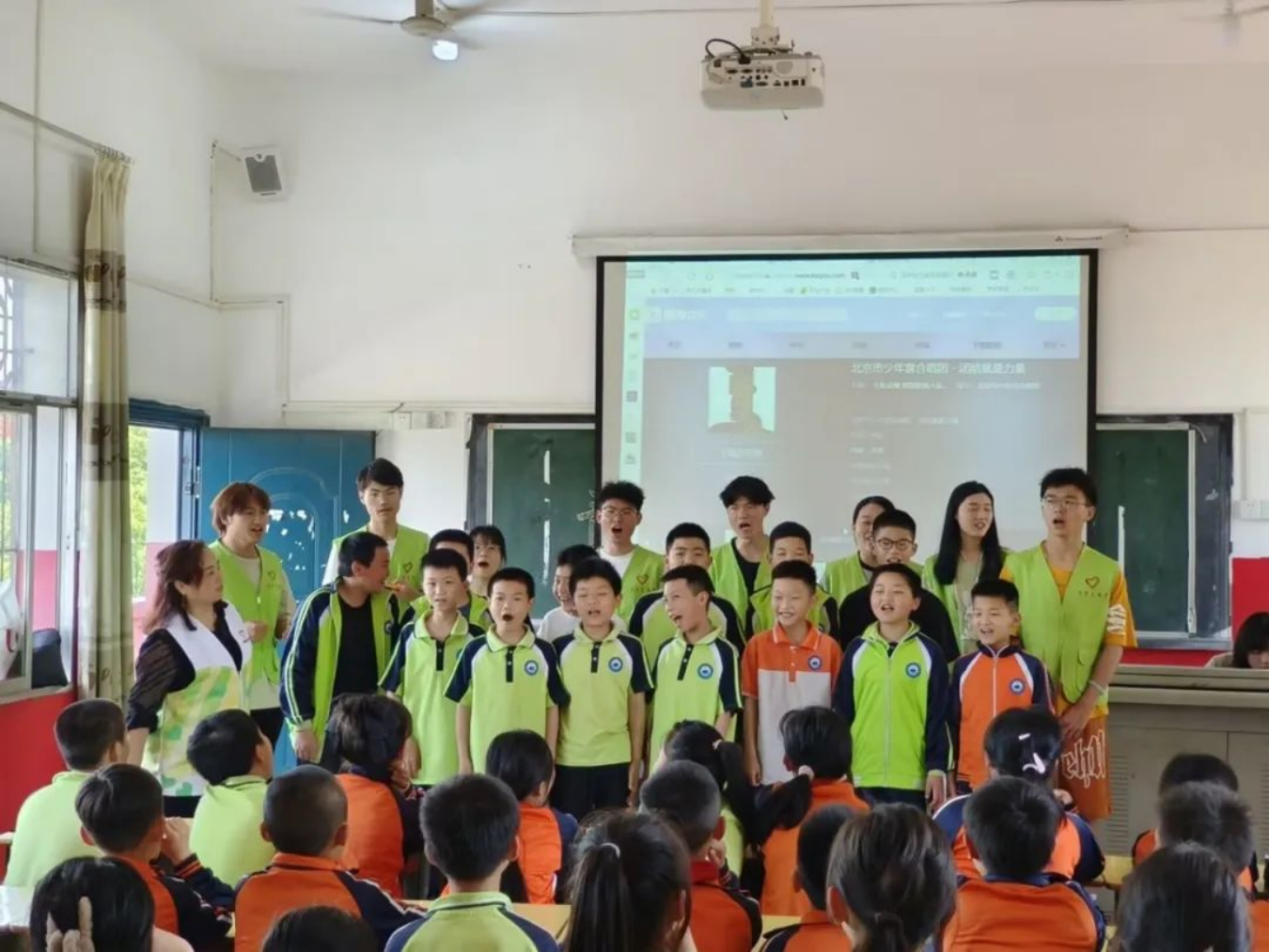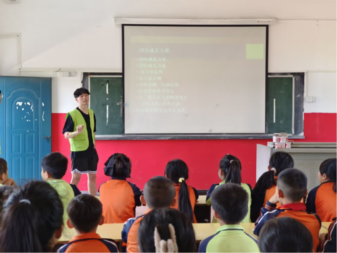 活动第二项是唱红歌。志愿者们教小朋友们唱《团结就是力量》,目的是让小朋友们懂得只有团结一心集体才能有力量这个道理。