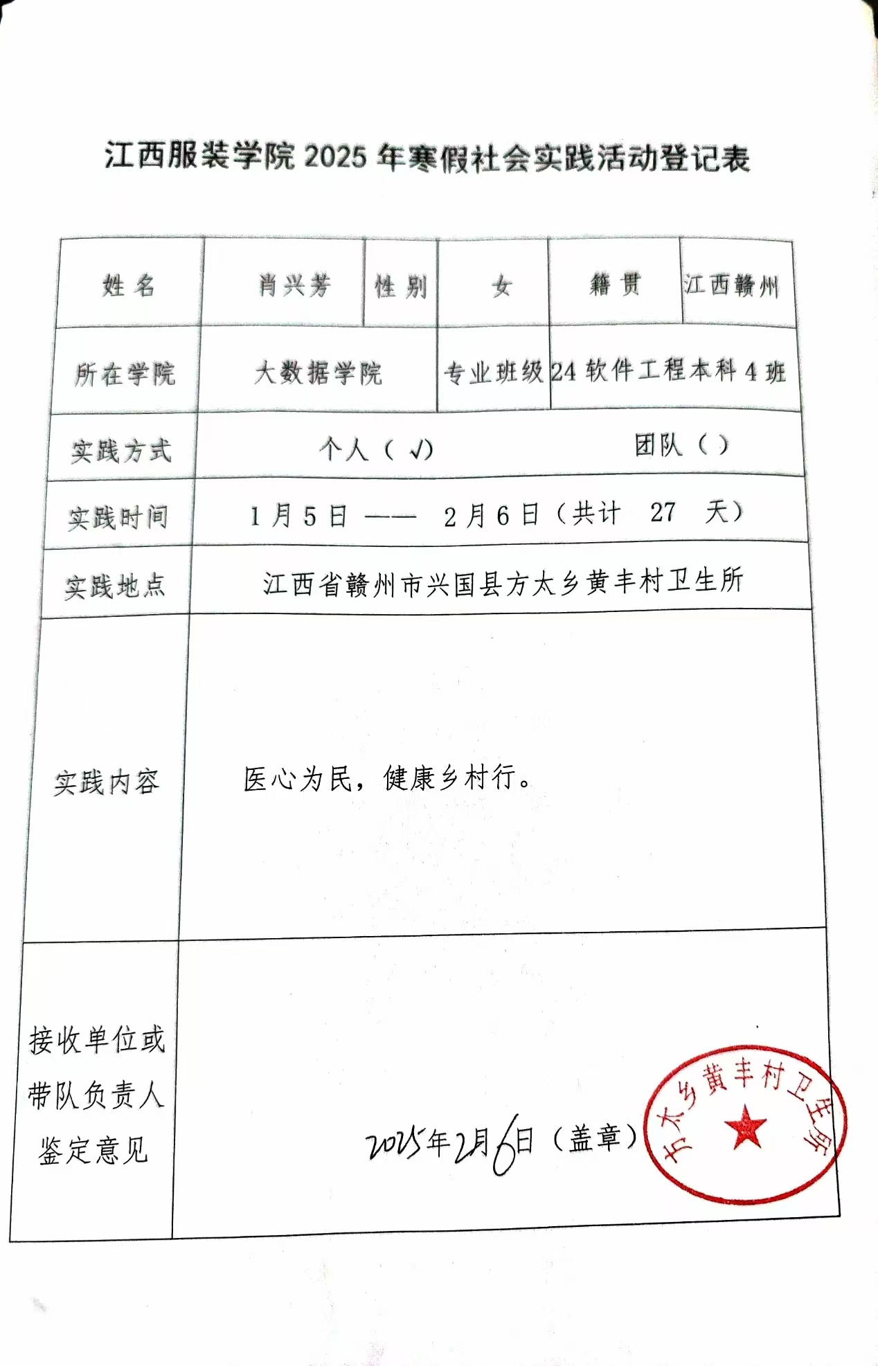 实践心得:寒假期间,黄丰村卫生所迎来了一位充满热情与责任感的志愿者——肖兴芳同学。她积极投身于卫生所志愿服务的社会实践活动,在实践中展现出新时代青年的担当与奉献精神。