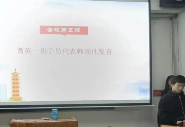 班主任代表黄薇发言。她对全体学员提出三点希望,第一,希望大家做一个“先行者”;第二,希望大家做一个“引领者”;第三,希望大家做一个“践行者”。