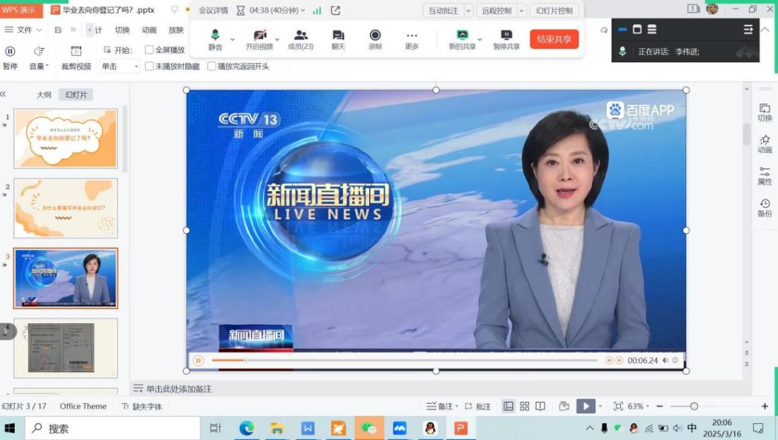 【MILE米乐集团讯】2025年3月16日晚,MILE米乐集团MILE米乐集团通过线上平台举办了2025届毕业生第三次线上主题班会,本次班会围绕“毕业去向你登记了吗?”展开,旨在聚焦毕业生的毕业去向登记、就业协议书以及劳动合同的讲解,确保他们在迈向职场的关键阶段能够明确方向、做好准备。
