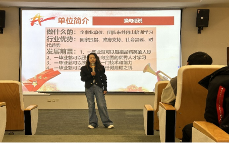 会议伊始,首先由井冈山新时代革命传统教育培训中心的周子妍对大家进行企业的基本情况介绍,分别从做什么的、行业优势、发展前景三个方面让同学们增进对企业文化的了解,以及以“弘扬井冈山精神,传承红色基因”为办学宗旨,遵循以史育人、以情感人的教学理念。