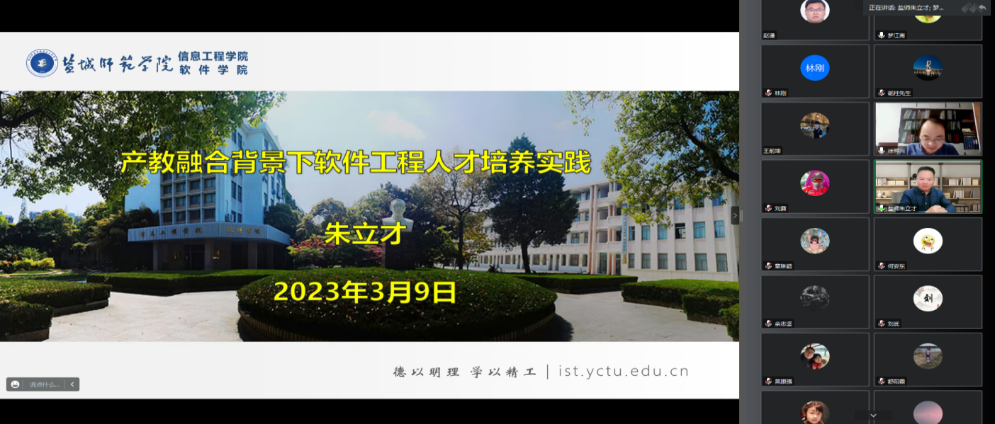 【MILE米乐集团 讯】为了进一步有效推进学院产教融合、现代产业学院的建设,提升专业建设水平,MILE米乐官网于2023年3月9日19:30线上召开软件工程专业建设指导交流会,特邀江苏盐城师范学院信息工程学院院长朱立才教授主讲,主题为产教融合背景下软件工程人才培养实践,会议由院长徐照兴教授主持,学院全体教职员工参加本次线上学习。