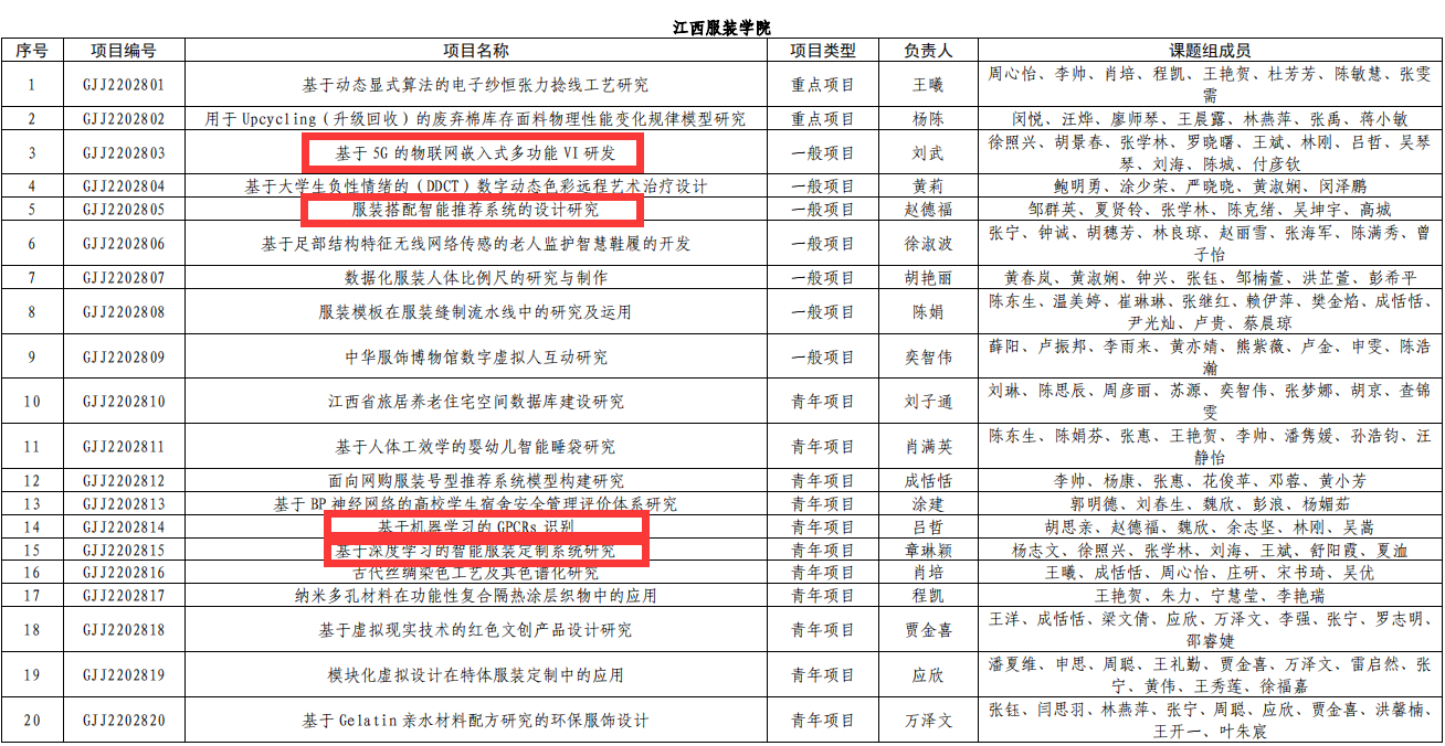 【MILE米乐集团讯】近日,江西省教育厅发布《关于公布2022年度江西省教育厅科学技术研究项目立项名单的通知》(赣教研字﹝2023﹞2号)文件,MILE米乐官网赵德福副院长主持申报的《服装搭配智能推荐系统的设计研究》、刘武教师主持申报的《基于5G的物联网嵌入式多功能VI研发》、吕哲教师主持申报的《基于机器学习的GPCRs识别》、章琳颖教师主持申报的《基于深度学习的智能服装定制系统研究》等4项获批立项,立项数创历史新高。