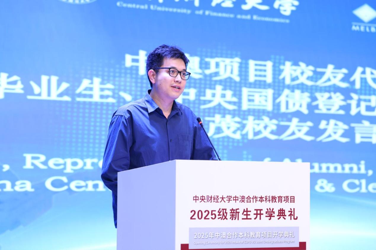 中澳项目统招生新生代表2025级中澳2班赵芳其同学发言。她表示,在百年变局加速演进的时代背景下,国贸学子应主动承担使命,努力成为融通中外、具有家国情怀和全球视野的复合型人才。最后,她呼吁同学们保持求知热情、投身实践创新、树立远大理想,珍惜校际资源与学院环境,力争通过四年学习成长为能够服务国家战略、参与全球治理的高层次经贸人才。